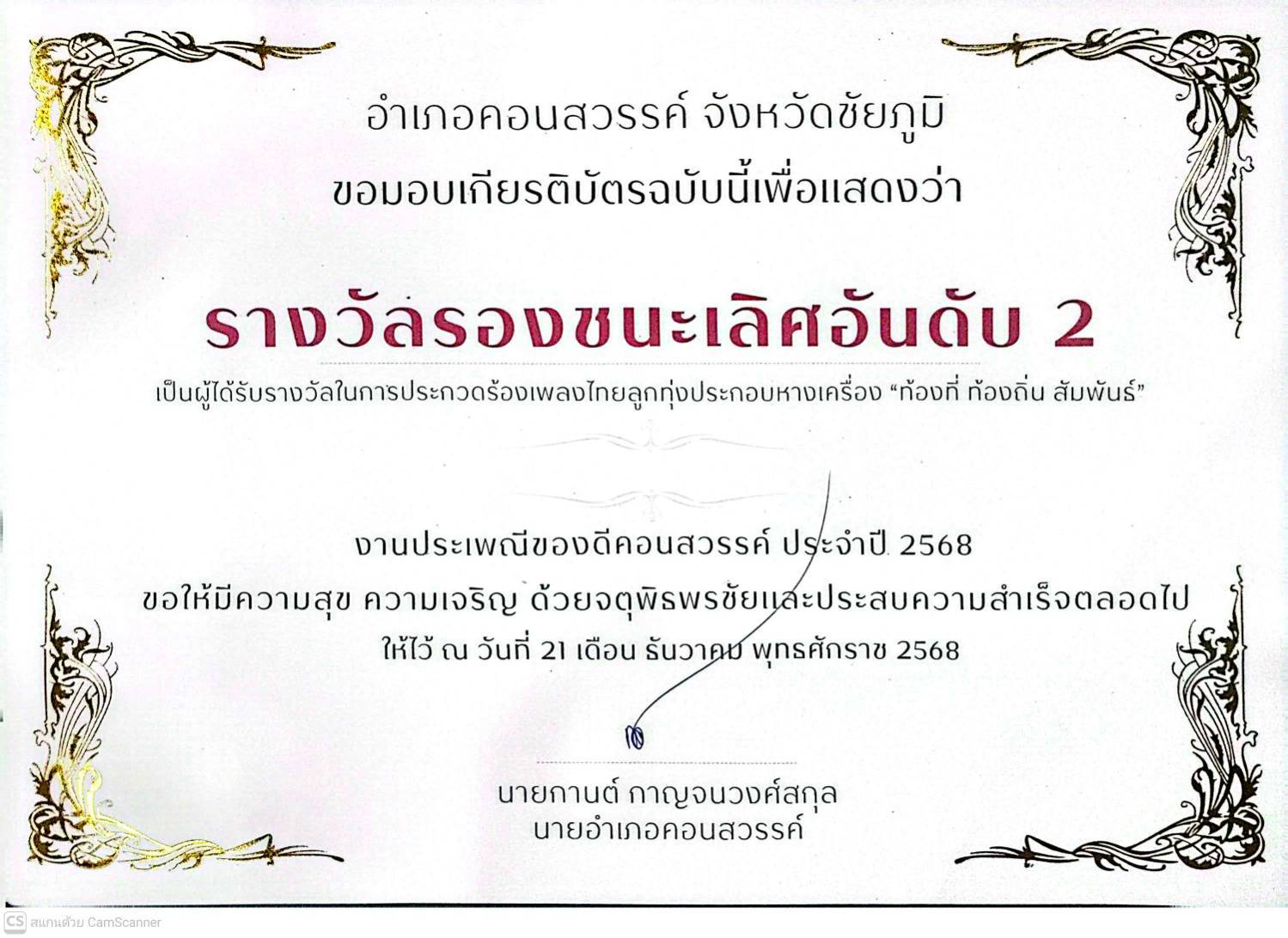 วันที่ 21 เดือน ธันวาคม พ.ศ. 2568 นายกันยา สงฆ์คลัง ปลัดองค์การบริหารส่วนตำบลยางหวาย พร้อมด้วยข้าราชการ พนักงานส่วนท้องถิ่น ร่วมแสดงความยินดีกับ ทีมนักร้องแดนเซอร์ อบต.ยางหวาย ได้รับรางวัลรองชนะเลิศอันดับ 2 ในการแข่งขันกิจกรรมการประกวดร้องเพลงไทยลูกทุ่งประกอบหางเครื่อง “ท้องที่ ท้องถิ่น สัมพันธ์” ในงานประเพณีของดีคอนสวรรค์ ประจำปี 2568 โดยมี นายกานต์ กาญจนวงศ์สกุล นายอำเภอคอนสวรรค์ เป็นประธานผู้มอบถ้วยรางวัล