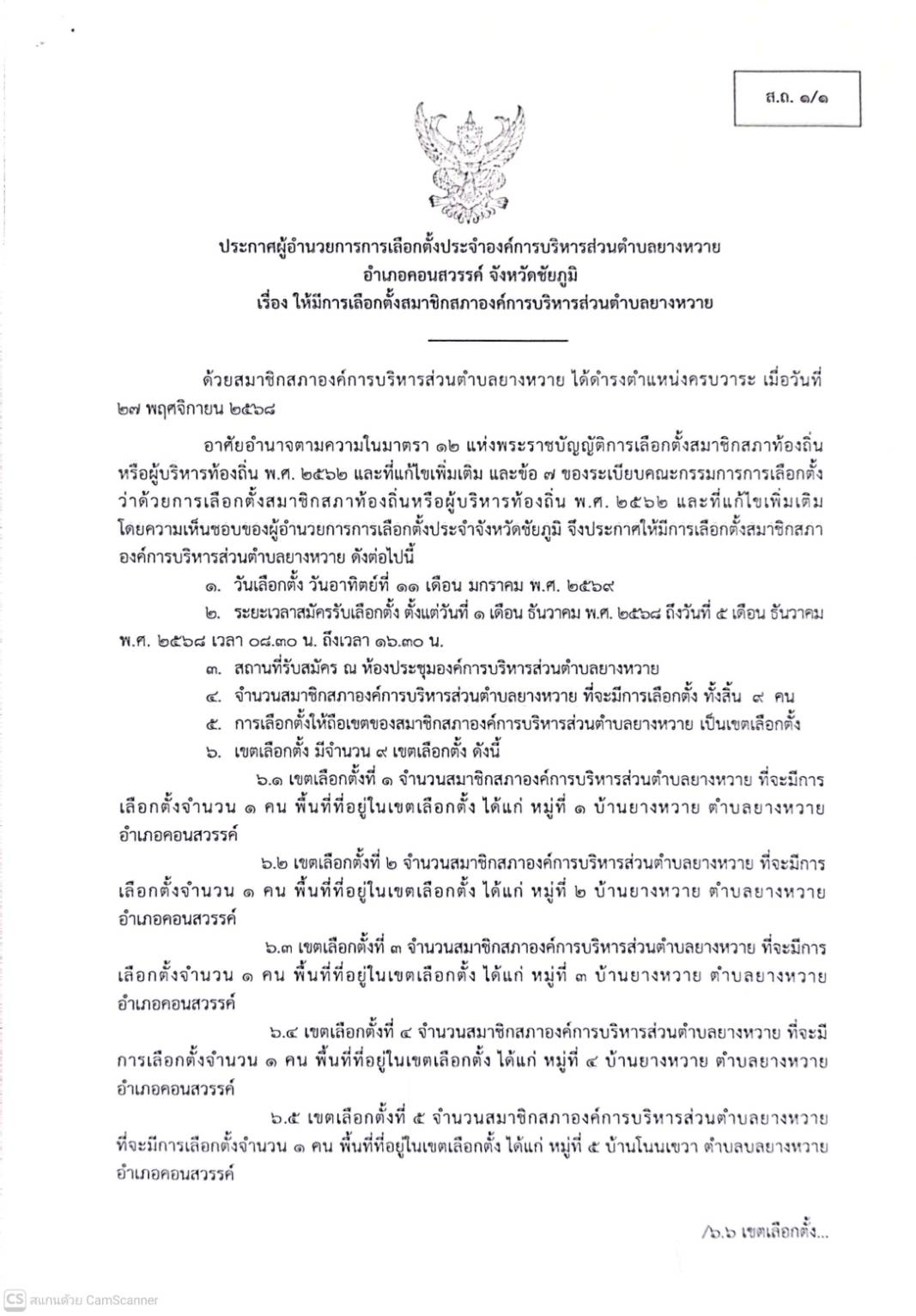 รับสมัครเลือกตั้งสมาชิกสภาองค์การบริหารส่วนตำบลและนายกองค์การบริหารส่วนตำบล ระหว่างวันที่ 1-5 ธันวาคม 2568 ณ ห้องประชุมองค์การบริหารส่วนตำบลยางหวาย